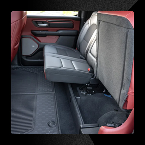 Made from thick MDF and formed specifically to fit every contour of your RAM, this custom enclosure features a pair of up-firing L7T 10-inch subwoofers and grilles with a monstrous 1,000-watts of recommended power. See details below.